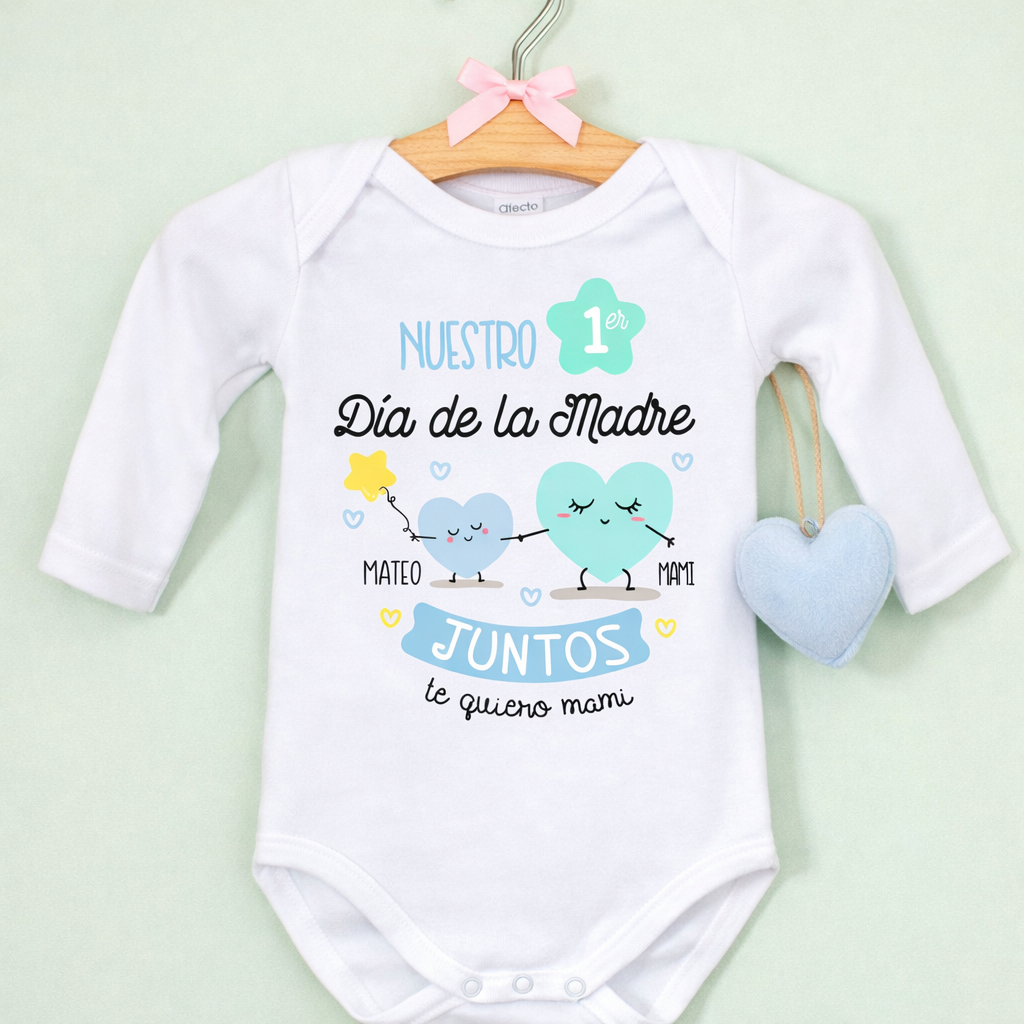 * El body se personaliza con el nombre del bebé, y si se desea algún cambio (por ejemplo en otra idioma, o el mensaje con dos papis o dos mamis, o añadir más corazones y nombres) se puede realizar, indicándolo en el apartado «notas de pedido» (lo verás aparecer tras la pestaña finalizar compra). Si necesitas ayuda no dudes en llamarnos a nuestro teléfono de contacto.