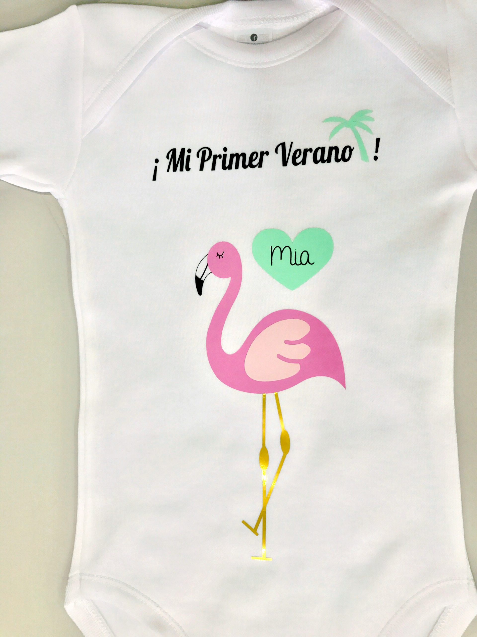 Body personalizado de textura muy suave. «Mi primer verano» ¿Qué sería de un verano sin flamencos? Las patitas de de este  original flamenco rosa son doradas.