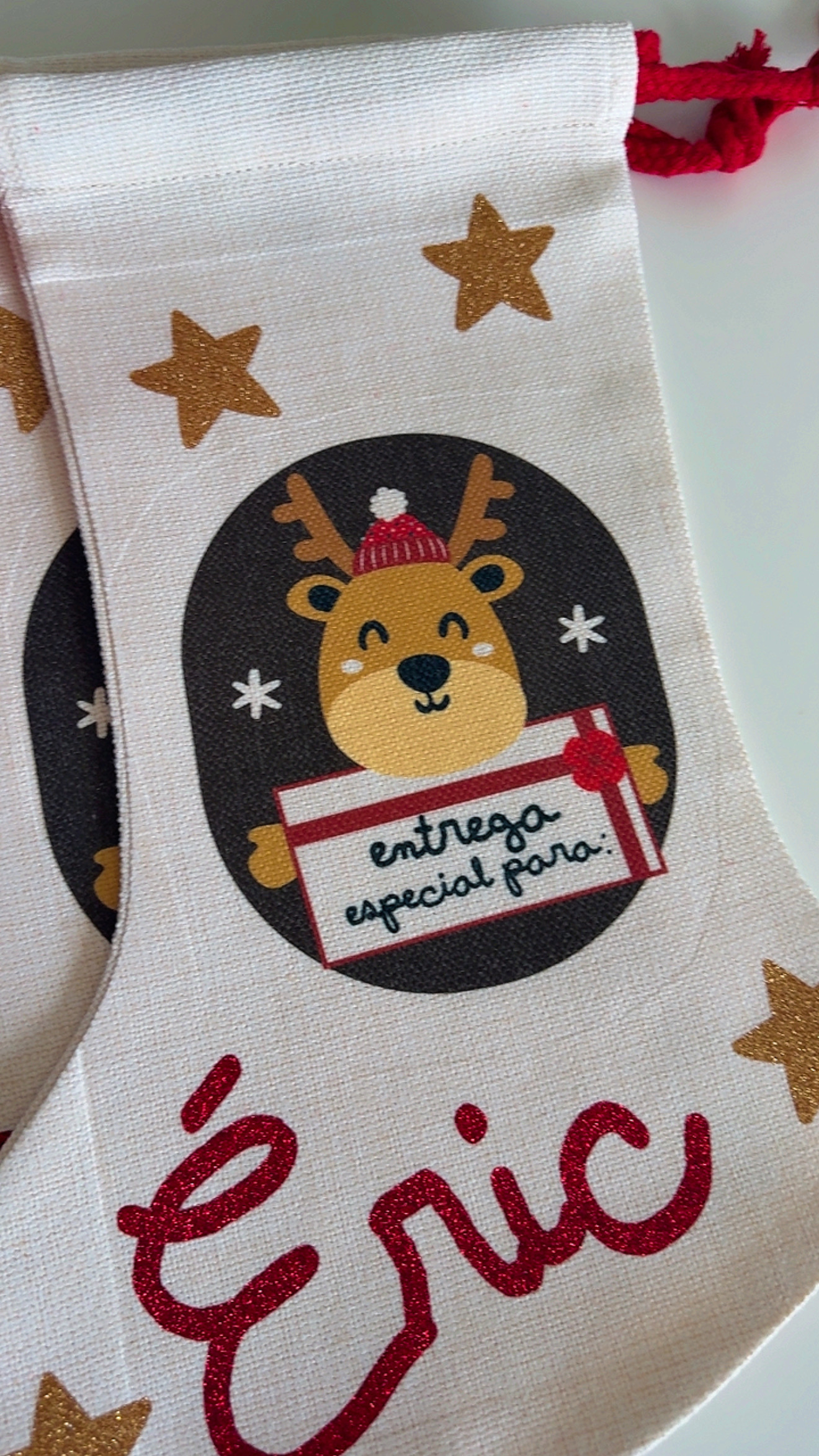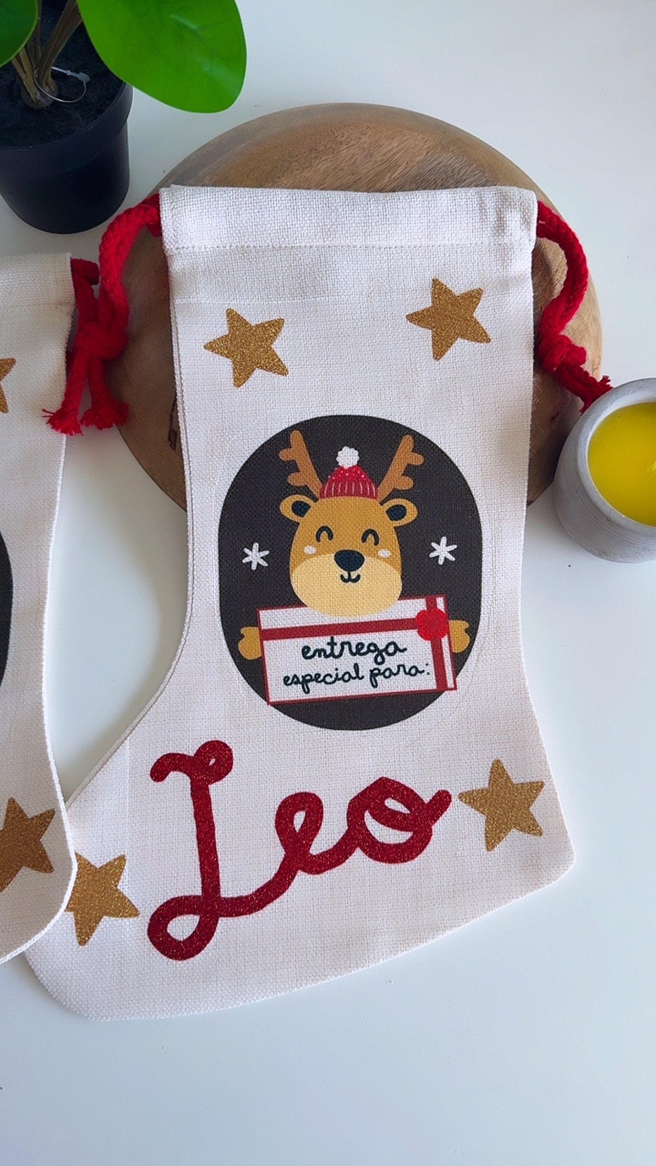 Con diseño de un Reno de Afecto Baby Shop y con detalles en purpurina dorada. Esta Bota Navideña Personalizada será ideal para decorar y perfecta para sorprender a los más pequeños. En su interior Papá Noel o los Reyes Magos podrán dejar algún regalito o dulces.