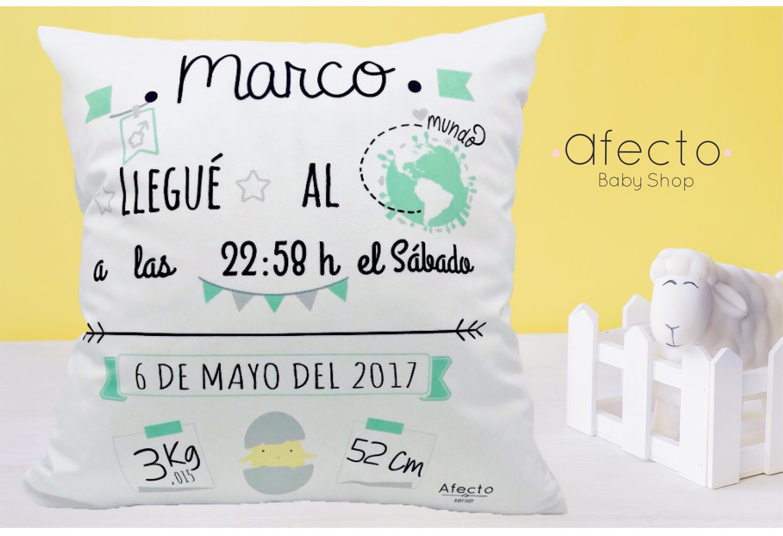 Cojín personalizado con los datos de nacimiento del bebé.  Textura muy suave, similar a la de un peluche. Tamaño 40×40. Incluye el relleno y la funda con cremallera para facilitar el lavado.